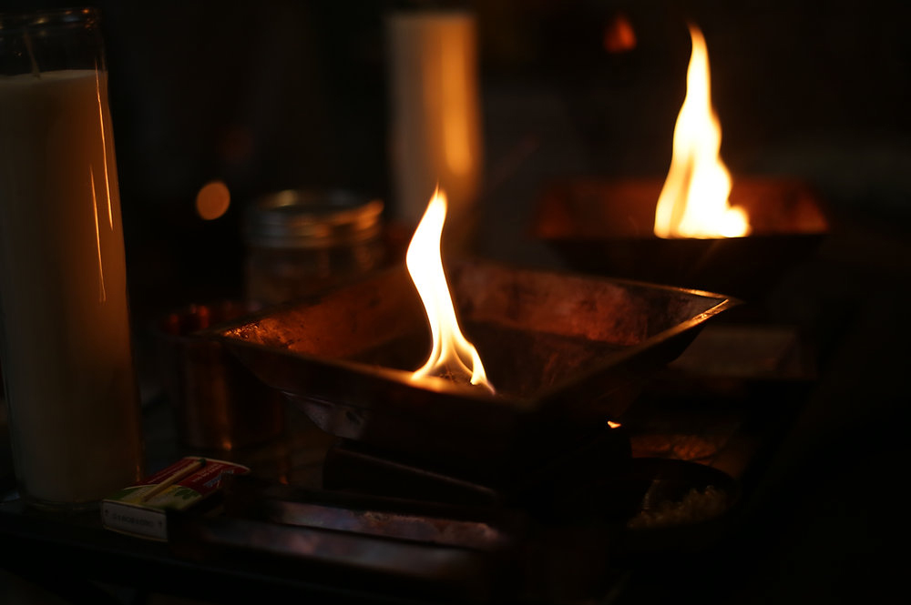 The fire is prepared in a small copper pyramid of specific size and shape. Brown rice, dried cowdung cakes and ghee (clarified unsalted butter) are the substances burned. Exactly at the time of sunrise and sunset the mantras are spoken and a small offering of rice and ghee is given to the fire.